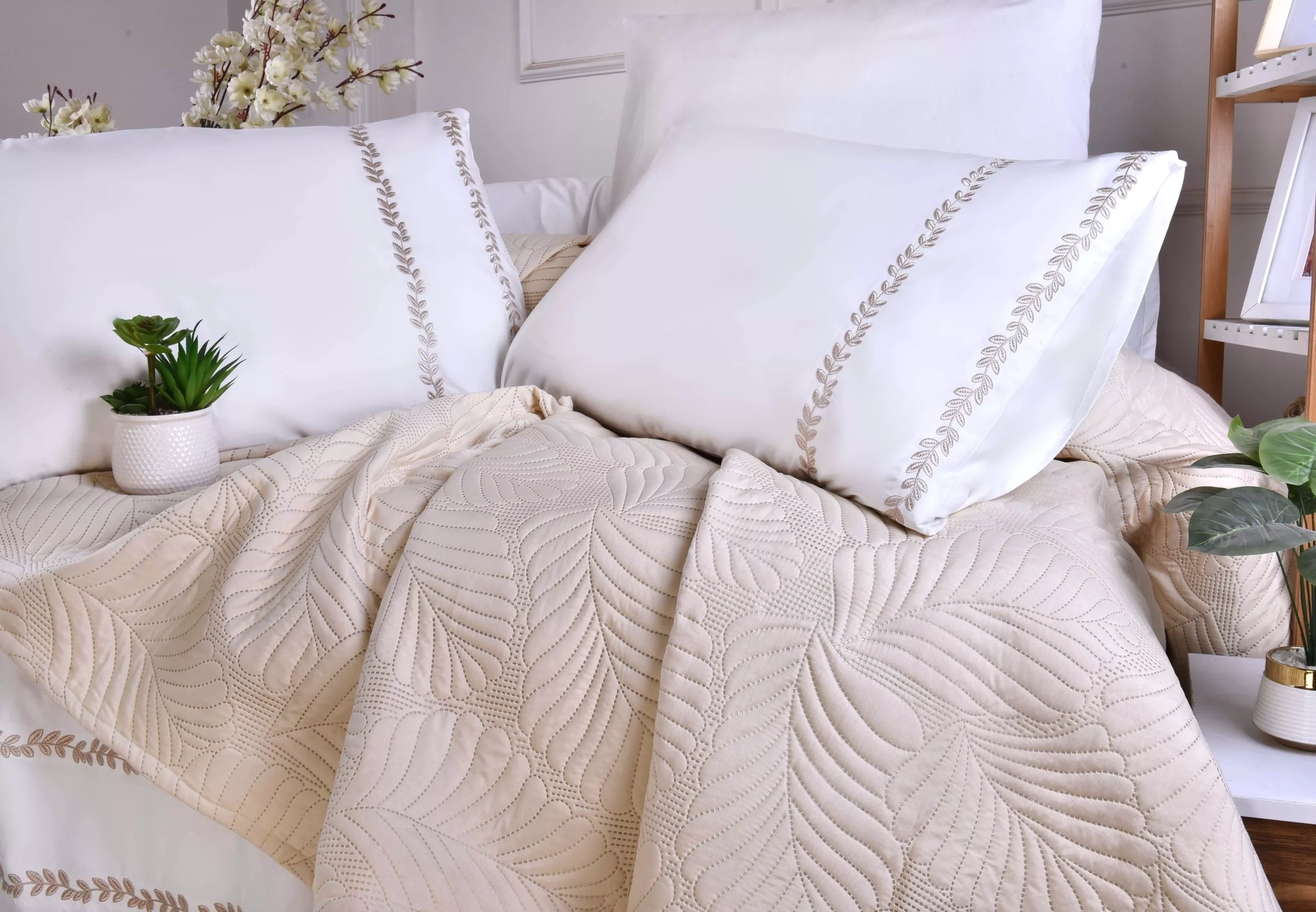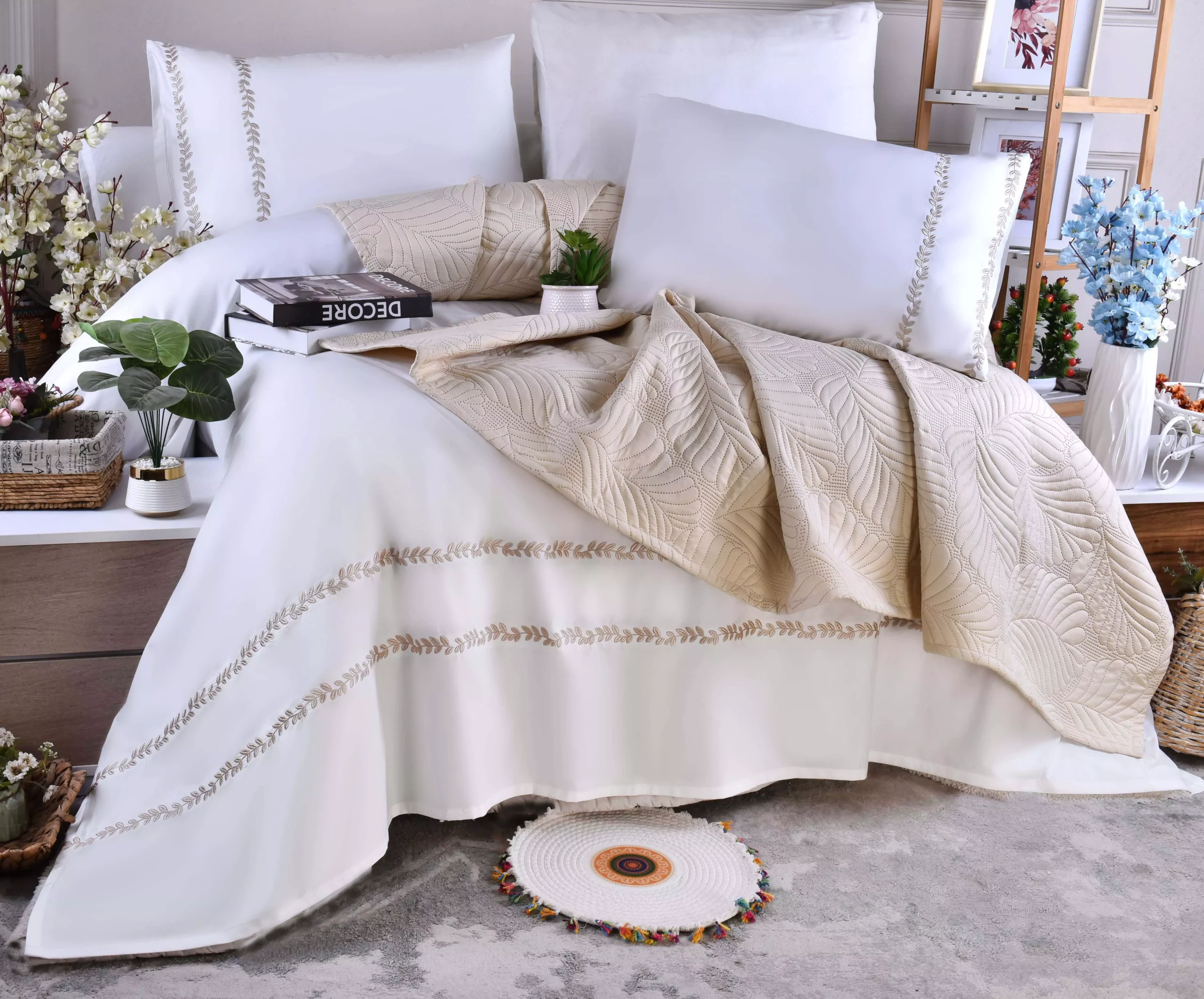 كوفرته كابتونيه ناعمة بتفاصيل فخمة، مع ملاية مُطرّزة بدقة تضيف لمسة فريدة لغرفتك 🌸